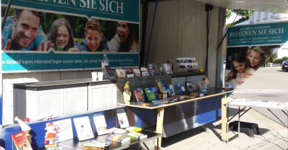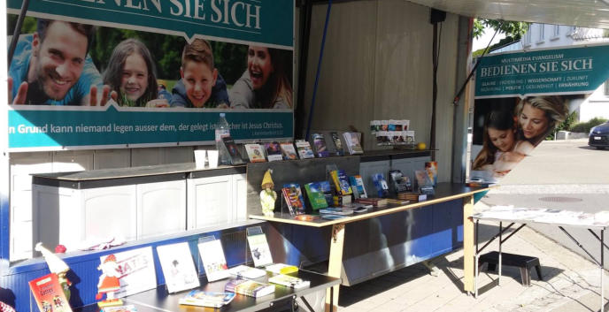 multimedia evangelism stellt ein Outreach-Mobil zur mobilen Evangelisation in verschiedenen deutschsprachigen Städten zur Verfügung. Überall dort, wo Menschen mit diesem Hänger unterwegs sind, können Gratisbücher, DVDs und CDs bezogen werden. Informationen zu unserem umfangreichen Material finden Sie auf dieser Homepage unter "Kostenlose Produkte". Auf Anfragen liefern wir Ihnen auch fremdsprachige Bücher.Aufgrund der schlechten Strassenverhältnisse im Winter, geht unser Outreach-Mobil ab Oktober in seine Winterpause. Sie können jedoch weiterhin kostenloses Bücher- und DVD-Material bei uns beziehen. Entweder, Sie schreiben uns ein Mail mit Ihren Wünschen und wir schicken Ihnen die Ware kostenlos per Post zu oder Sie besuchen uns an der WEGA-Messe oder am Weihnachtsmarkt in St. Gallen. Genaue Daten entnehmen Sie bitte unserem Terminkalender unter dieser Rubrik.
